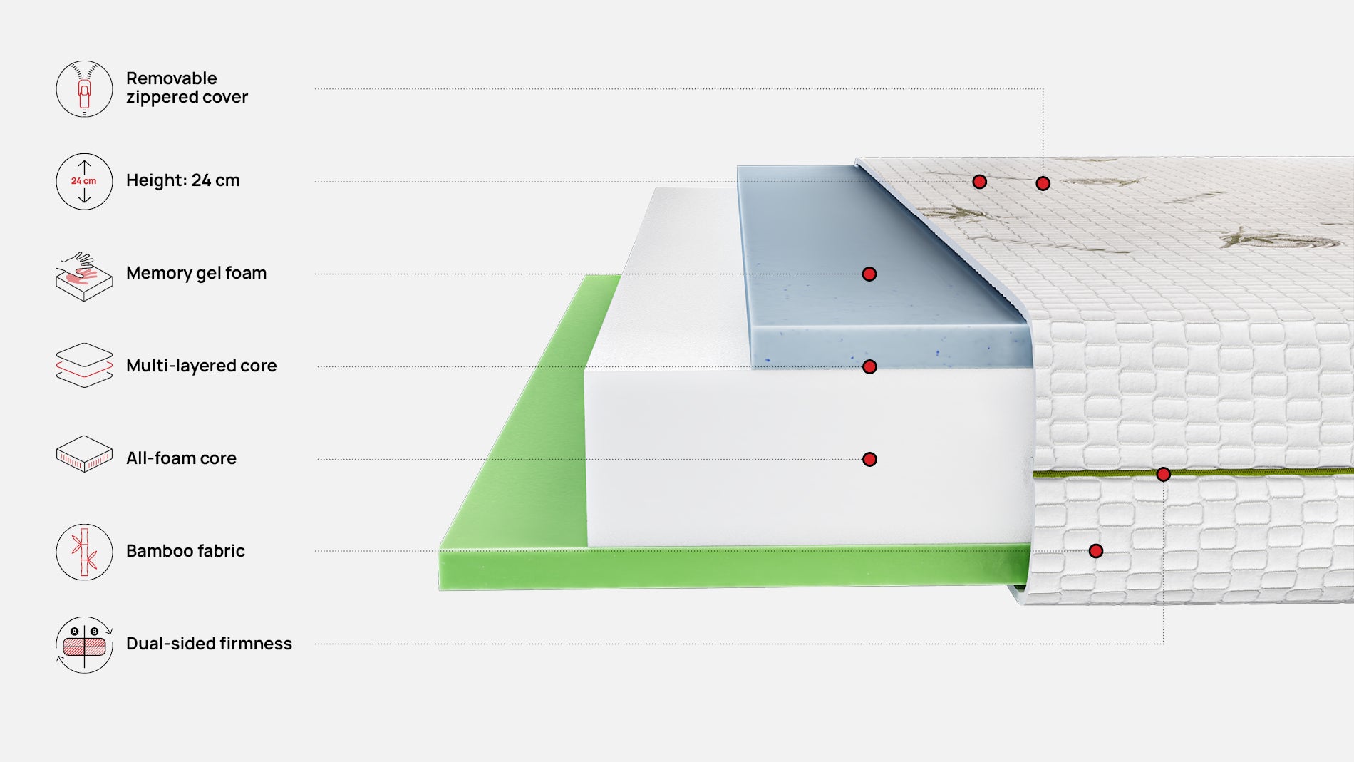 The cover is made of soft bamboo fabric with natural antibacterial properties, ensuring good ventilation and suitability for sensitive skin. The removable cover allows easy maintenance and a hygienic sleep environment.