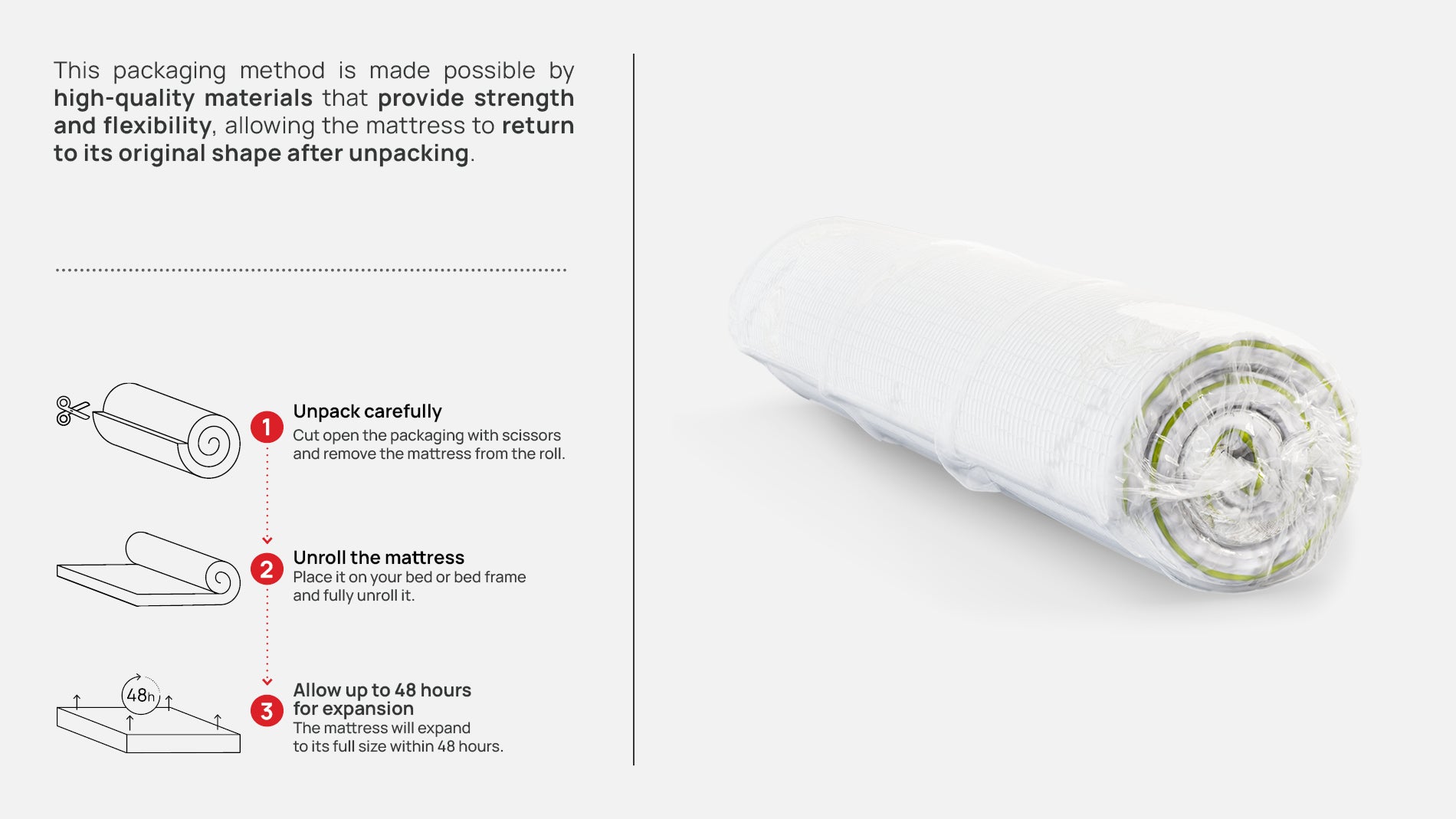 Vacuum-sealed mattresses must be unpacked within 30 days of receipt to maintain the warranty. After unpacking, the mattress should not be used for 24–72 hours to allow it to fully expand to its original shape.
