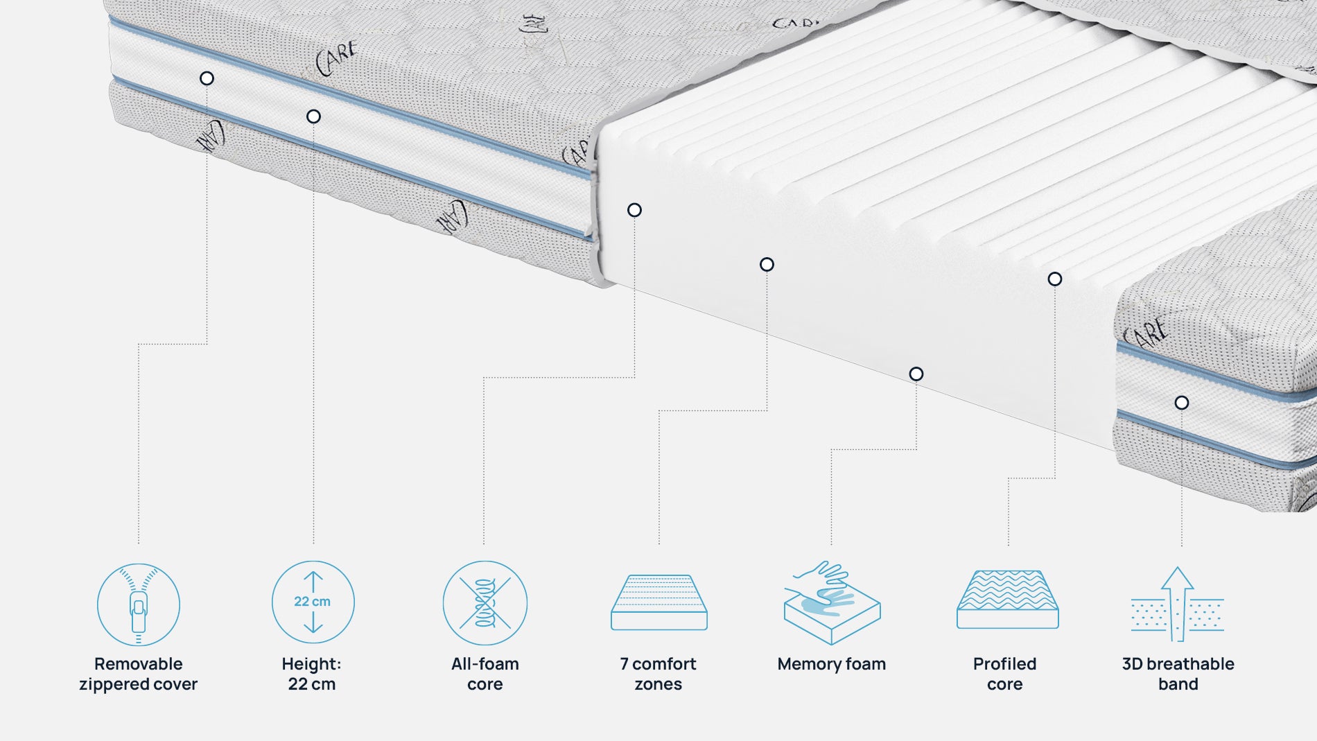 Το πολυτελές ύφασμα Silver Care έχει ασημένιες κλωστές που έχουν αντισηπτική δράση και προστατεύουν εσάς και την οικογένειά σας. Η θήκη διαθέτει φερμουάρ, που επιτρέπει την εύκολη αφαίρεση και καθαρισμό. Αυτό μπορεί να γίνει είτε με πλύσιμο στο πλυντήριο σε χαμηλή θερμοκρασία είτε με στεγνό καθάρισμα.
