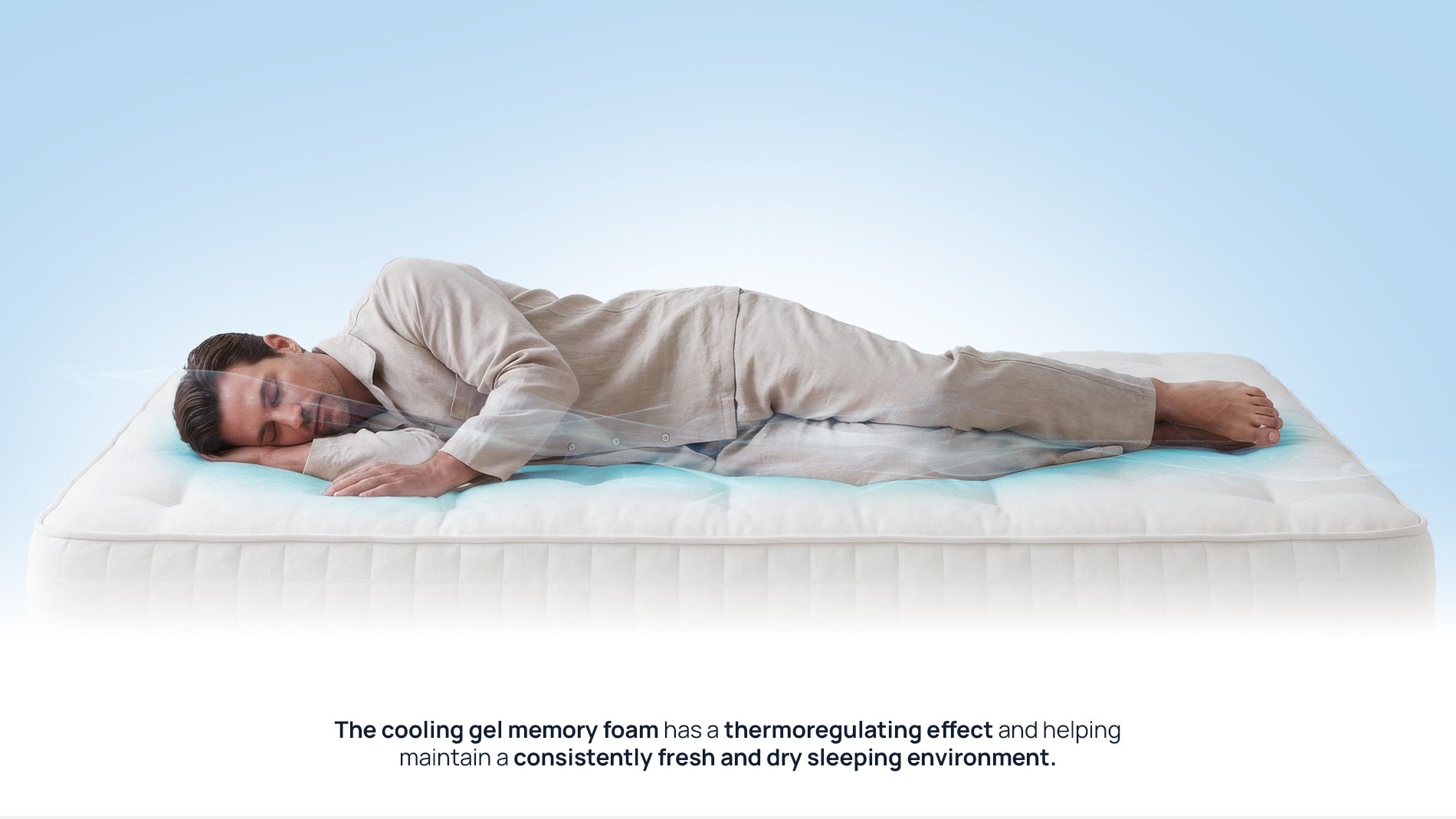 - Ο αφρός με ψυκτικό τζελ έχει θερμορυθμιστική δράση και εξασφαλίζει ένα σταθερά ξηρό περιβάλλον ύπνου.