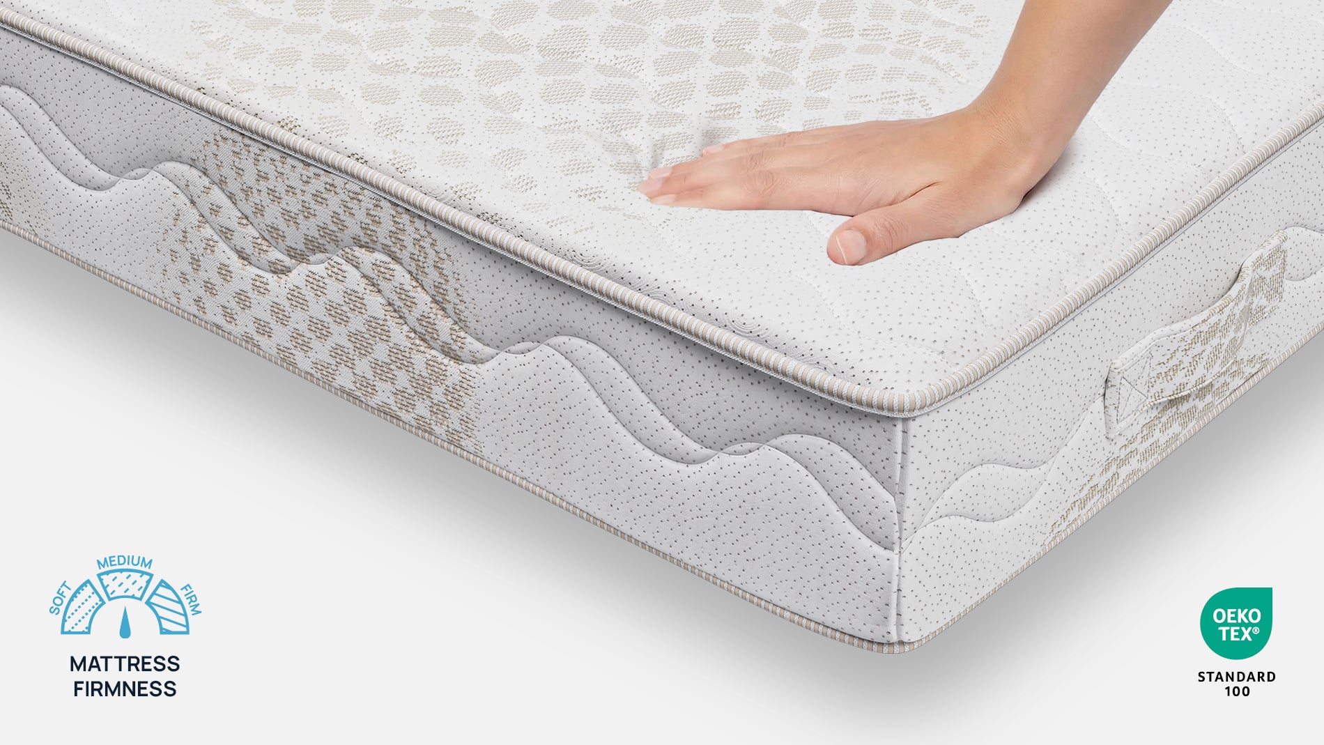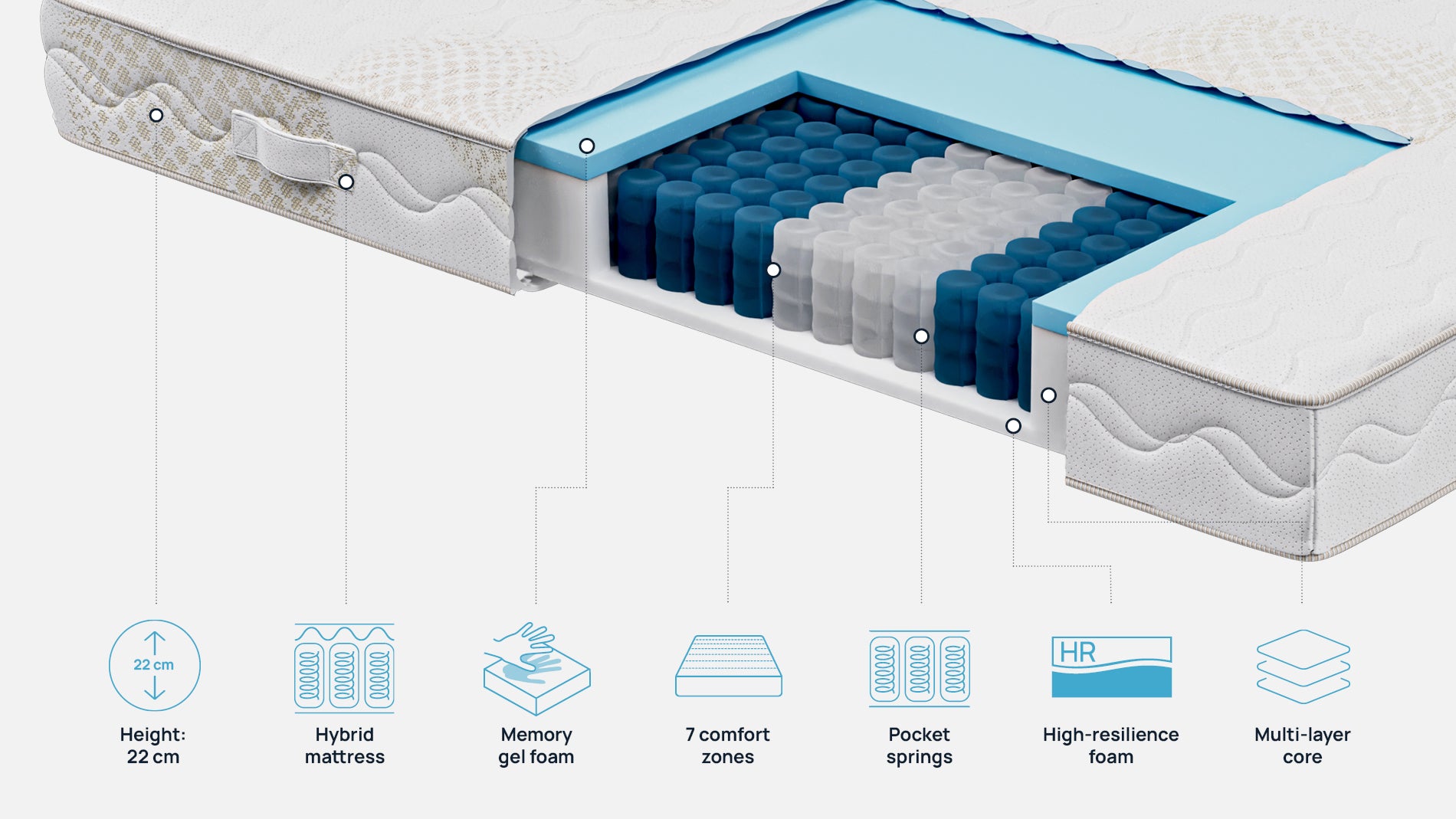 Ο πυρήνας του στρώματος αποτελείται από ένα σύστημα με ανεξάρτητα ελατήρια 7 ζωνών, μια στρώση μνήμης αφρού 4 εκ. με κάψουλες ψυκτικού τζελ και έναν ελαστικό αφρό 2 εκ. Το πολυτελές ύφασμα του στρώματος είναι καπιτονέ με χοντρή βάτα, και η βάση καλύπτεται με ελαστικό αφρό και ύφασμα με τεχνολογία υπερηχητικής ραφής χωρίς ραφές. Οι 100% ορθοπεδικές ιδιότητες του στρώματος το καθιστούν το πιο προτιμώμενο στρώμα για άτομα που υποφέρουν από πόνο στην πλάτη, τη μέση και τις αρθρώσεις. Το στρώμα ανακουφίζει την συσσωρευμένη ένταση, καθώς κατανέμει σωστά το βάρος του σώματος σε όλη την επιφάνεια του στρώματος.